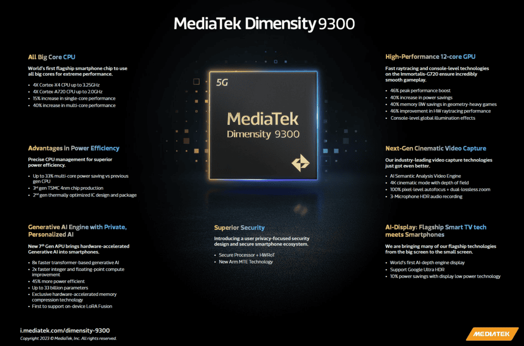 Likewise, the 4nm Dimensity 9300 incorporates MediaTek’s enhanced thermal design to reduce overheating and clock speed reductions.