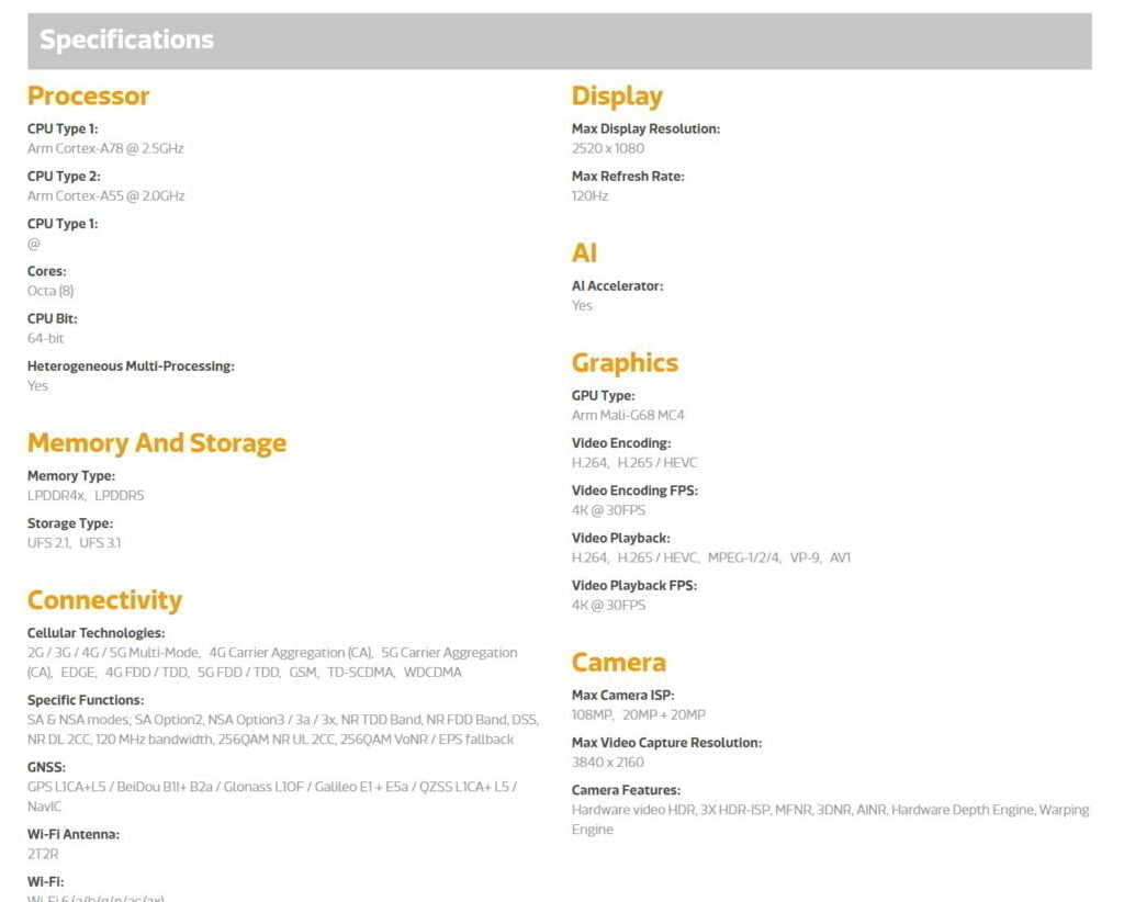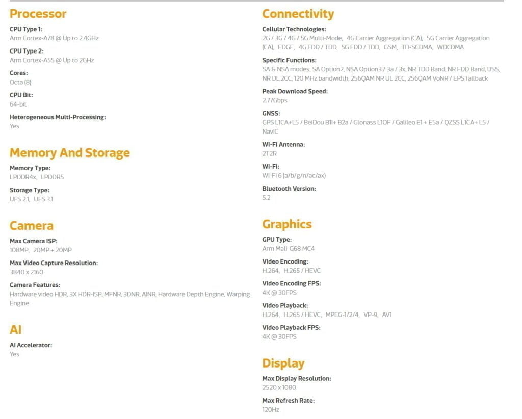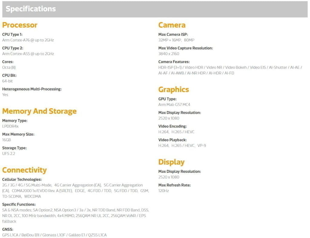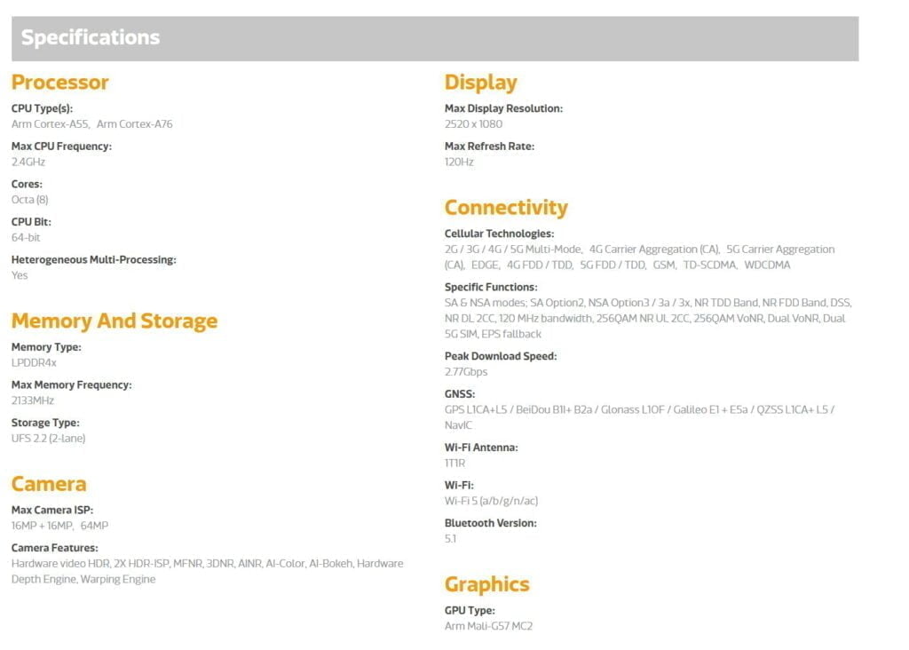 The chipset has an octa-core CPU, with two ARM Cortex-A78 cores clocked at up to 2.5GHz then six Arm Cortex-A55 @ 2.0GHz.