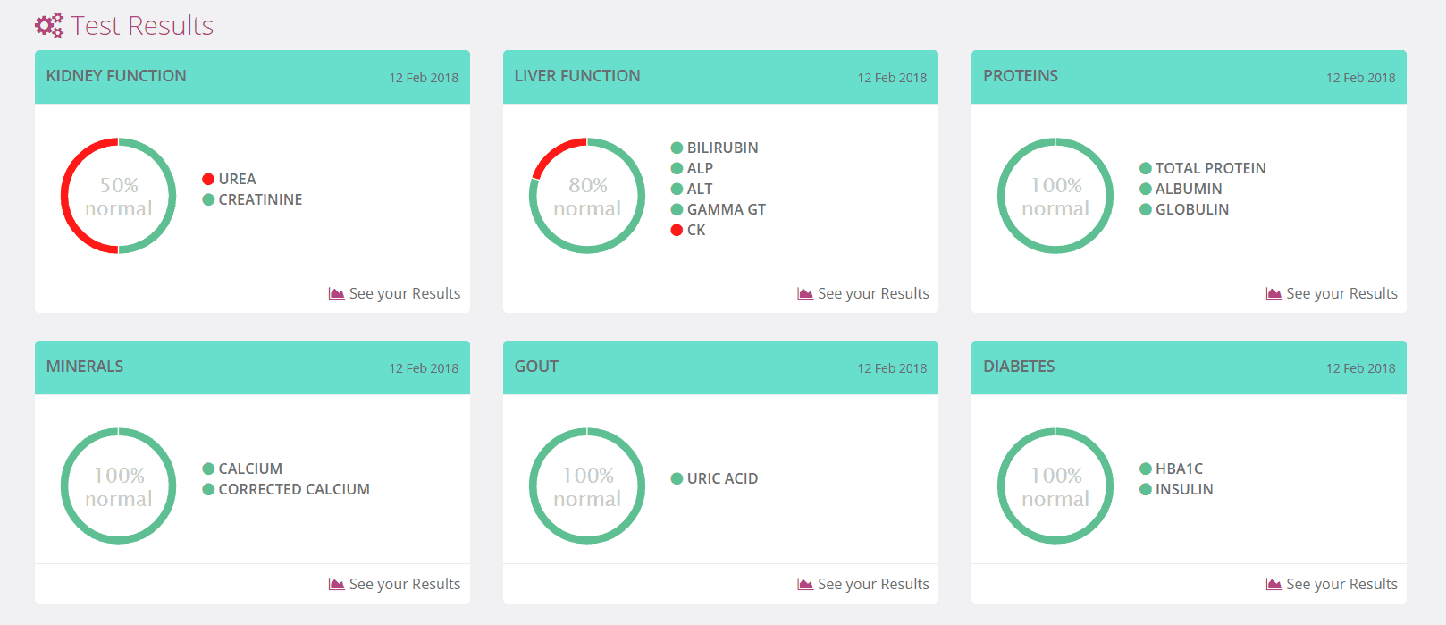 In recent months Medichecks have improved their online system, so if you go out for the main results in your dashboard, you get a more friendly view of your data in nice pie charts. Is test is broken down into its corresponding category, and you have an easy way to see what things fell out of normal range.