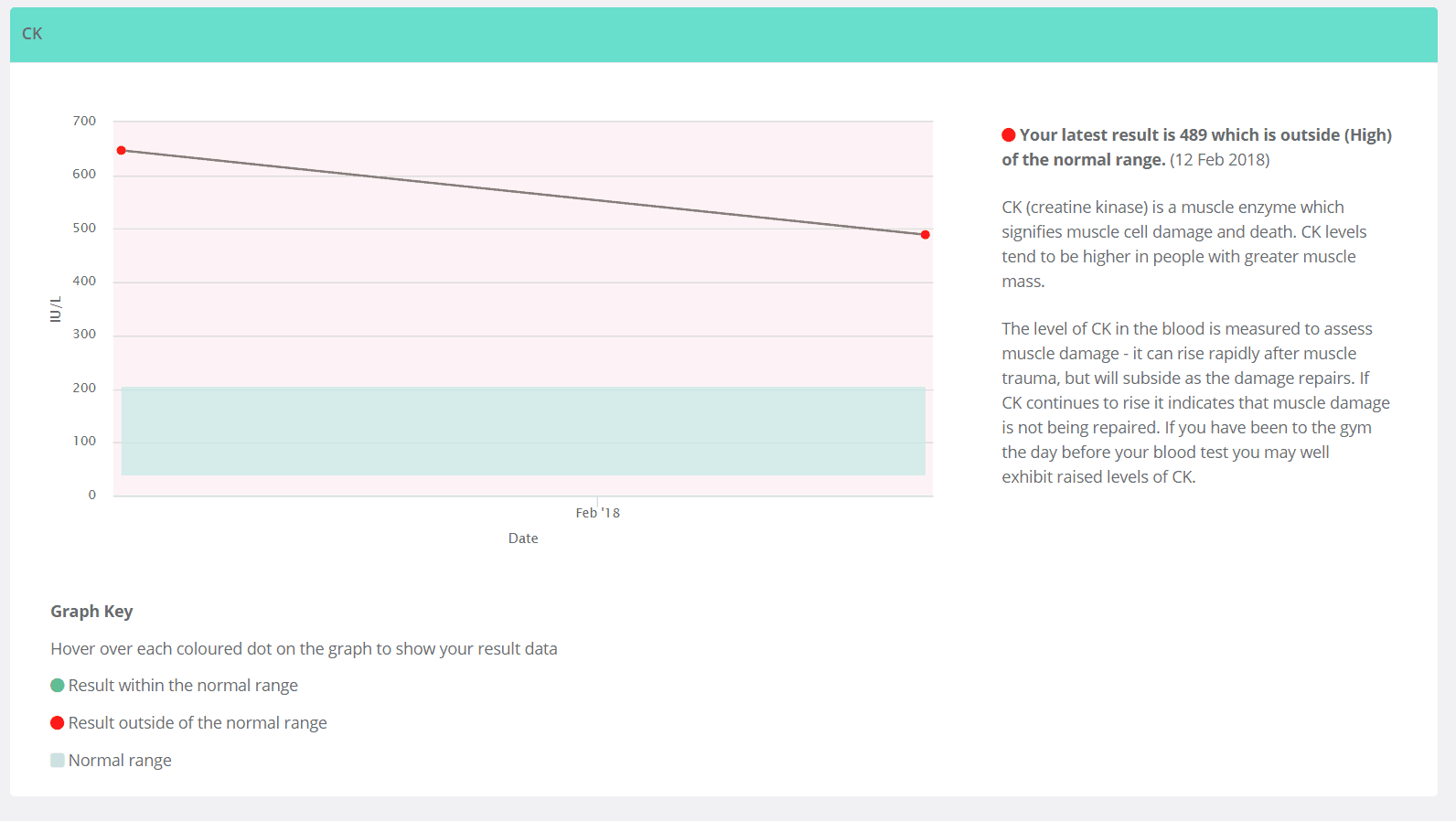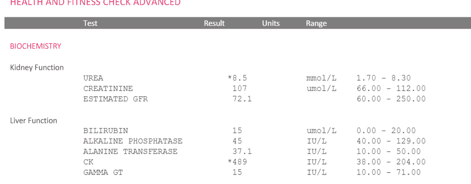 In my case nearly all my tests came back within range. I had slightly raised levels of urea, but this is likely due to being dehydrated after the night, and raised levels of CK (creatine kinase) which is likely due to regular strenuous gym sessions.