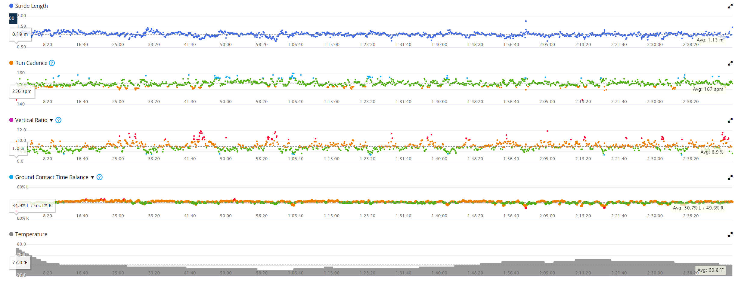 The device also measures leg swing, and mine is almost always classed as low. This is less efficient, and a high leg swing means you are keeping your body movement closer to the centre of gravity. My most recent long run had a mid-leg swing which is an improvement, but I am not sure how I achieved it. With my run 3 weeks away, it is probably too late to mess around with my form too much, but it is something I will experiment on more in the future.