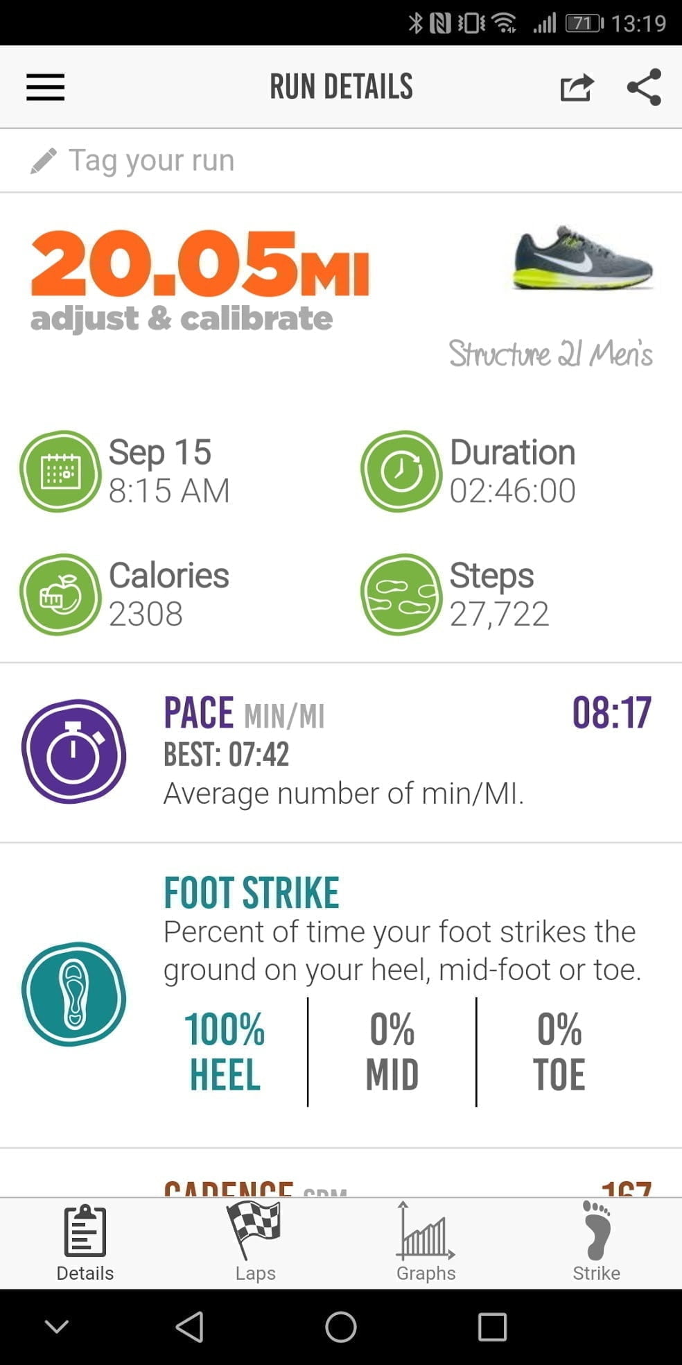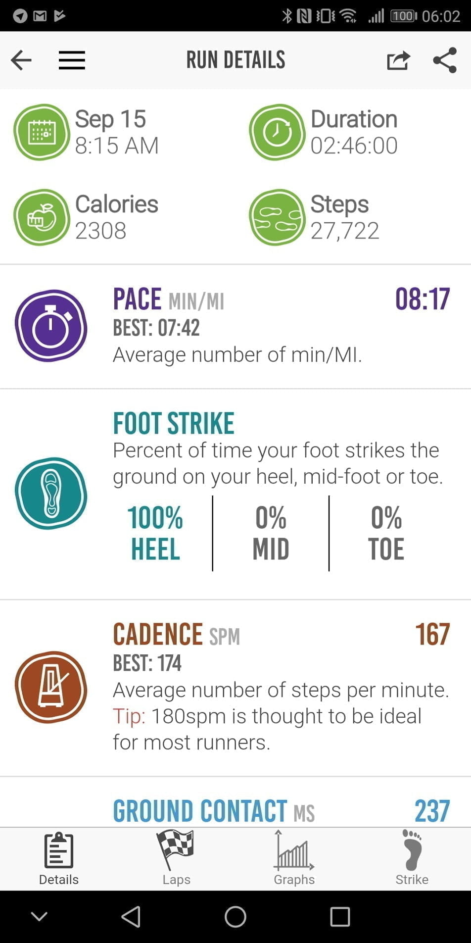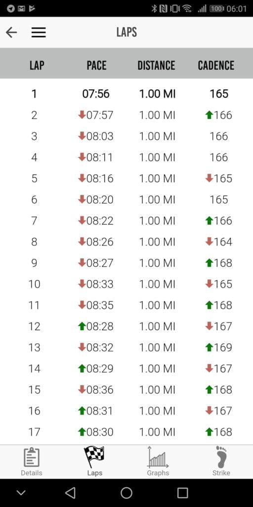 I don’t have a huge number of devices to compare this to, but the ground contact time and cadence appear to match up with the HRM-Run, and I already know I had a heel foot strike, so all the data is accurate as far as I can tell.