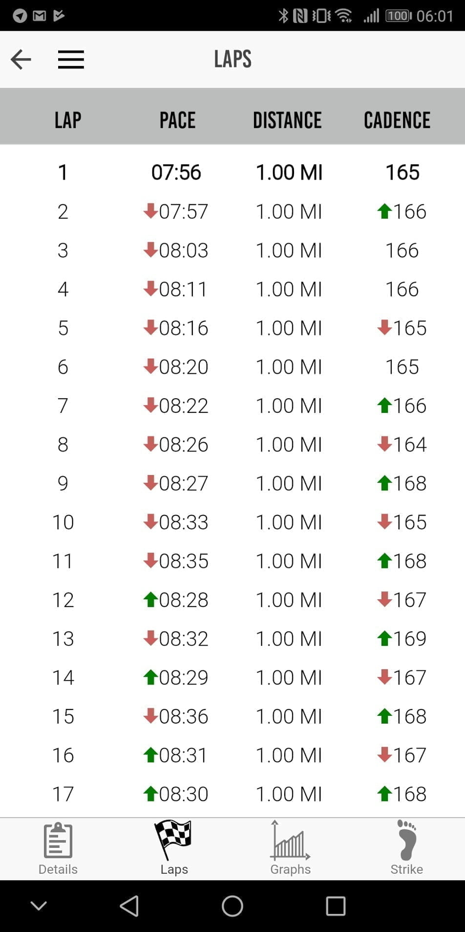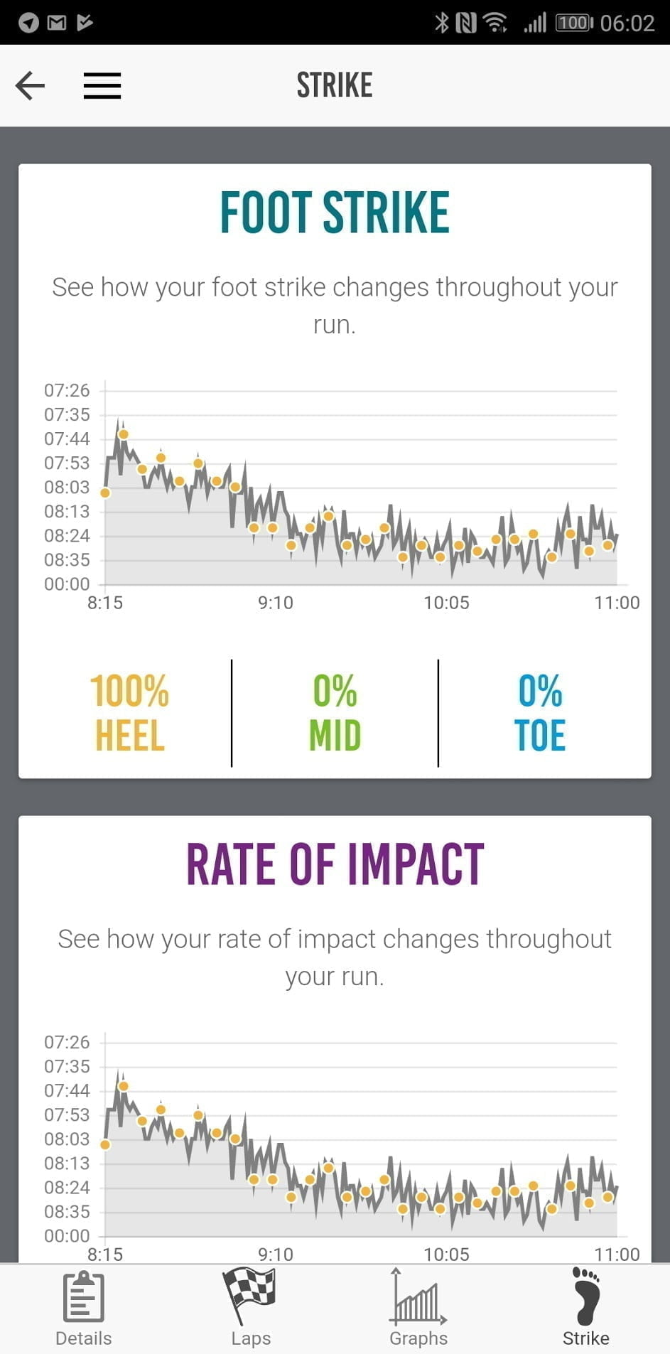 My outdoor runs 100% favour heel striking, and this was more or less what I was aware of so there was no surprise there.