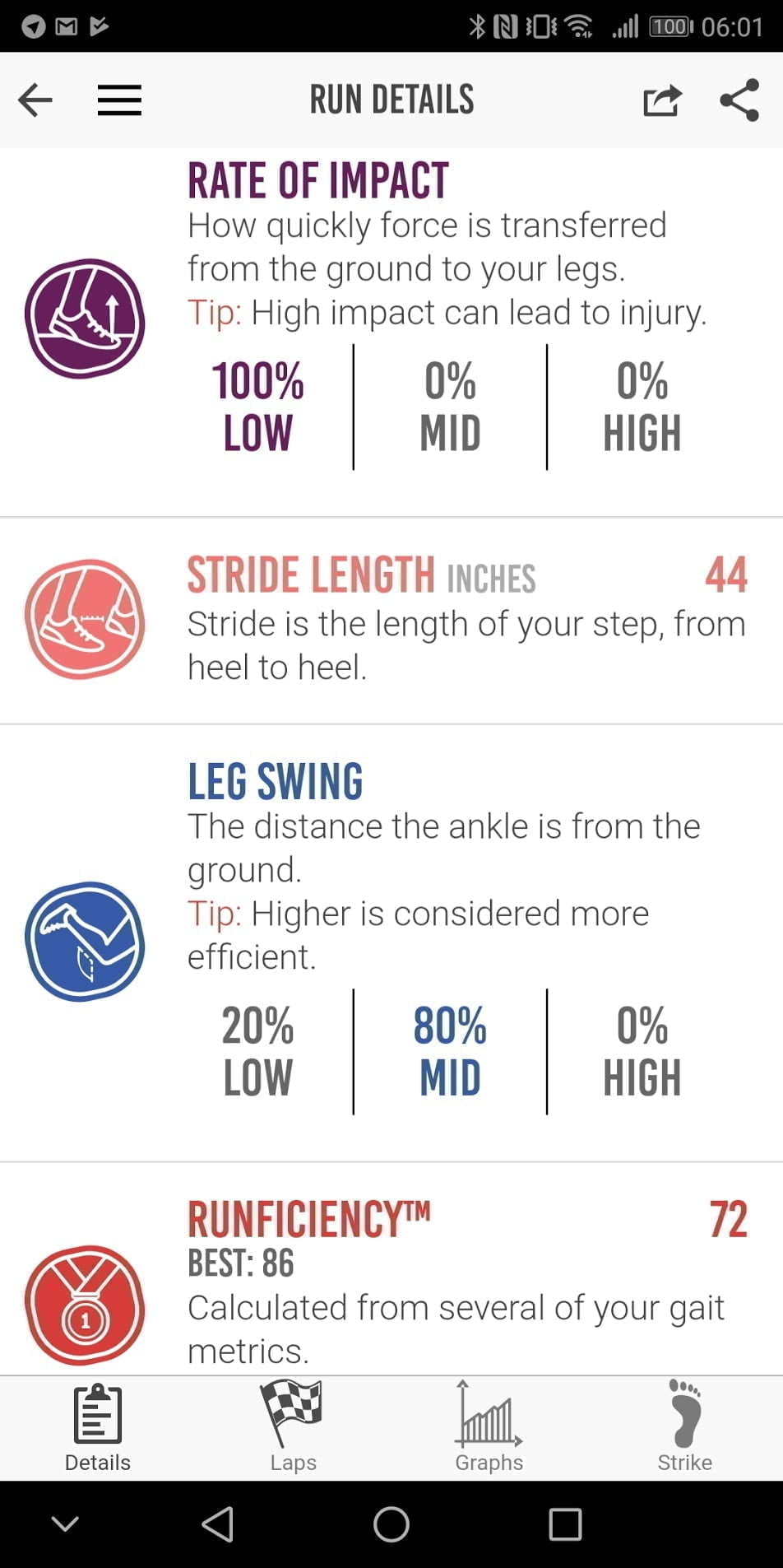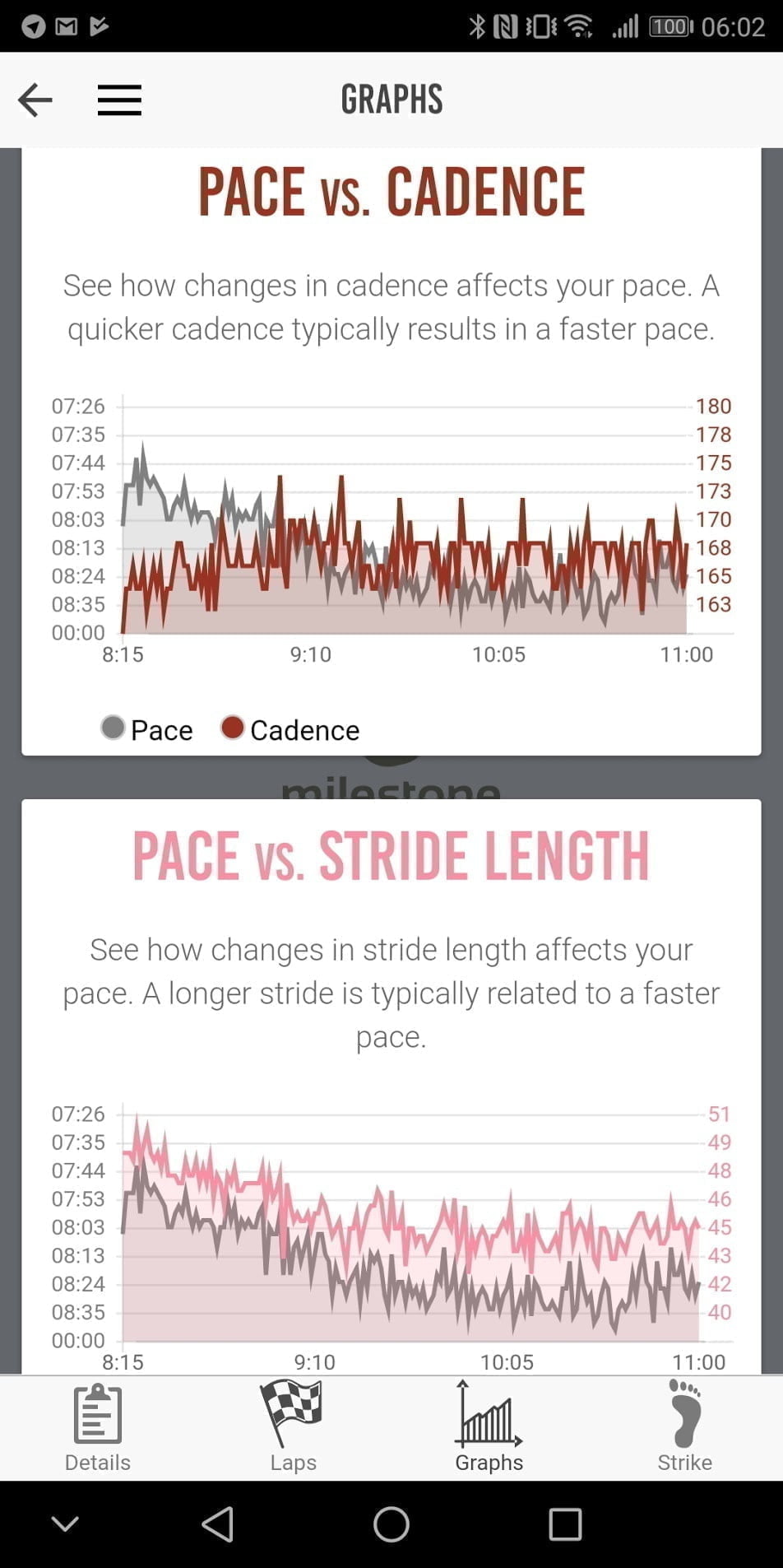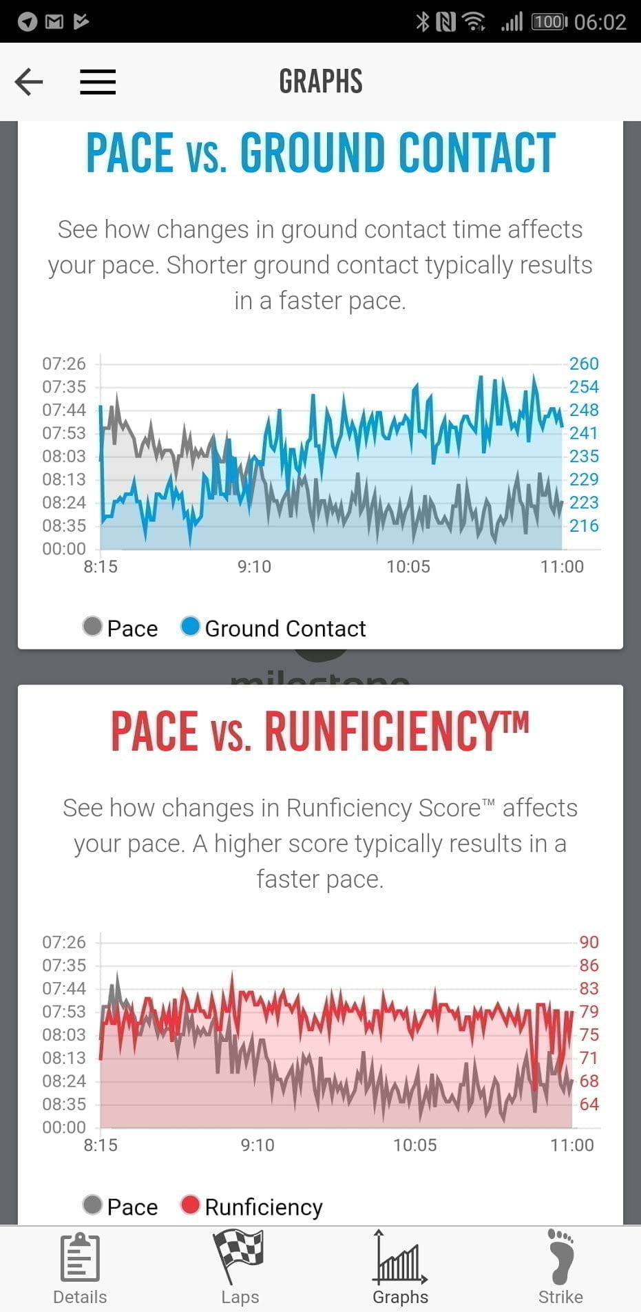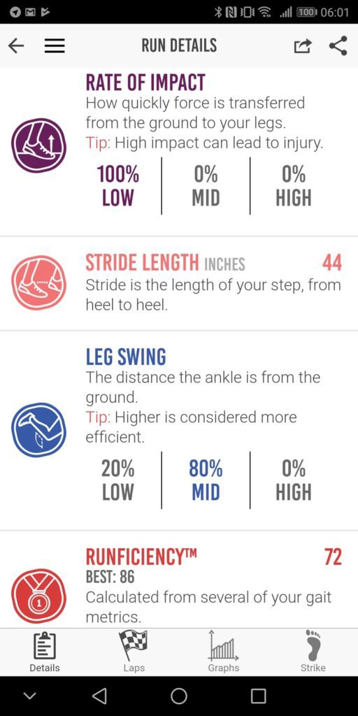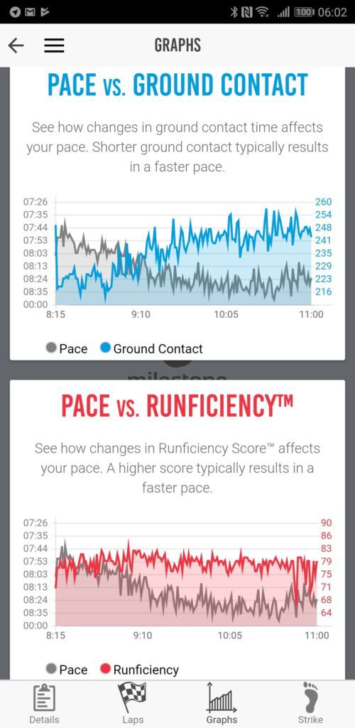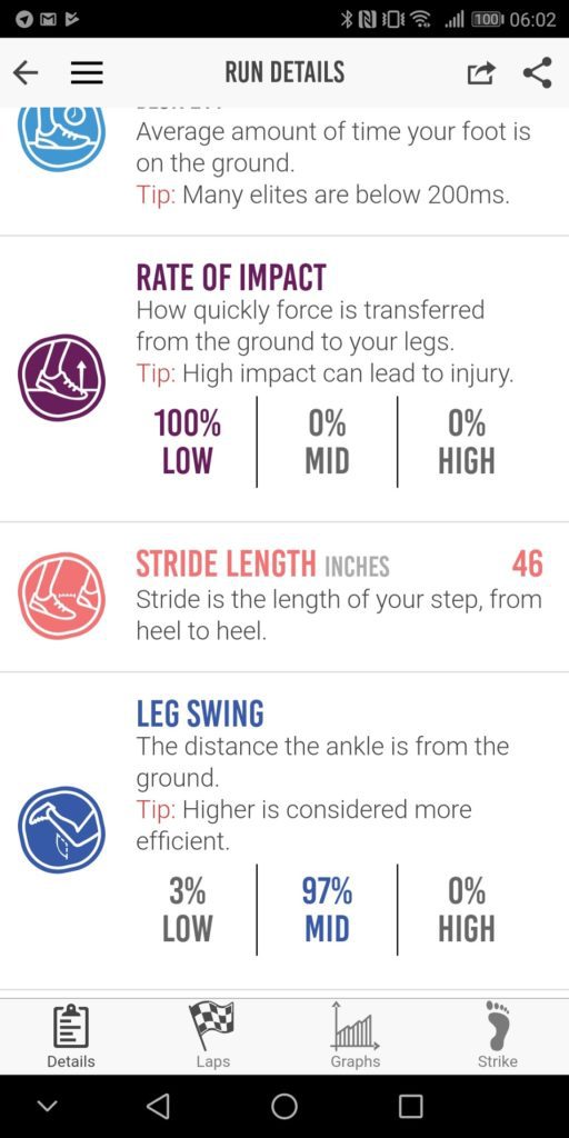 The app has many of the features you will find in the Garmin Connect app such as ground contact time and cadence. However, for me, it adds some key metrics including foot strike position, and rate of impact, then you also get leg swing data and stride length. The Milestone then uses all these metrics to provide you with a run efficiency score.