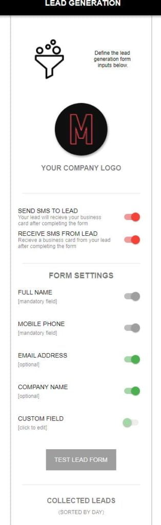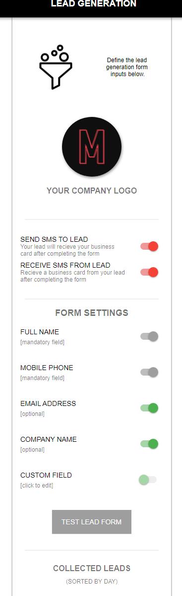 The lead generation tool is another excellent option; this links out to a customisable form where you can collect a users name, mobile number, email address, company name and a custom field. When they complete the form, you can have the system send an SMS text message to them with your contact details, and also receive a text message yourself with their details.