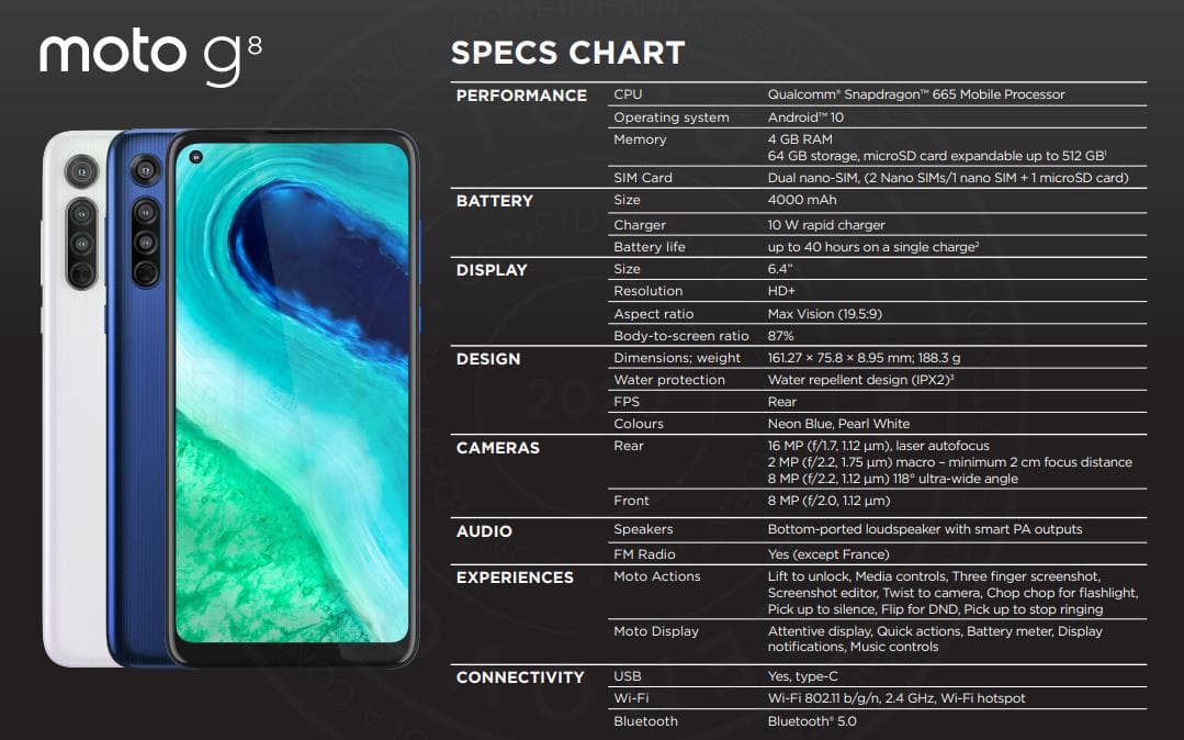 moto g8 comes with our exclusive Moto Experiences and with the new Moto Gametime4 feature. This exclusive software maximizes your gaming experience and makes it more immersive than ever by blocking interruptions to help you keep your head in the game. The device comes with a water-repellent3 design that keeps your phone protected inside and out, and is powered by a bloatware-free and ultra-clean version of Android™ 10.