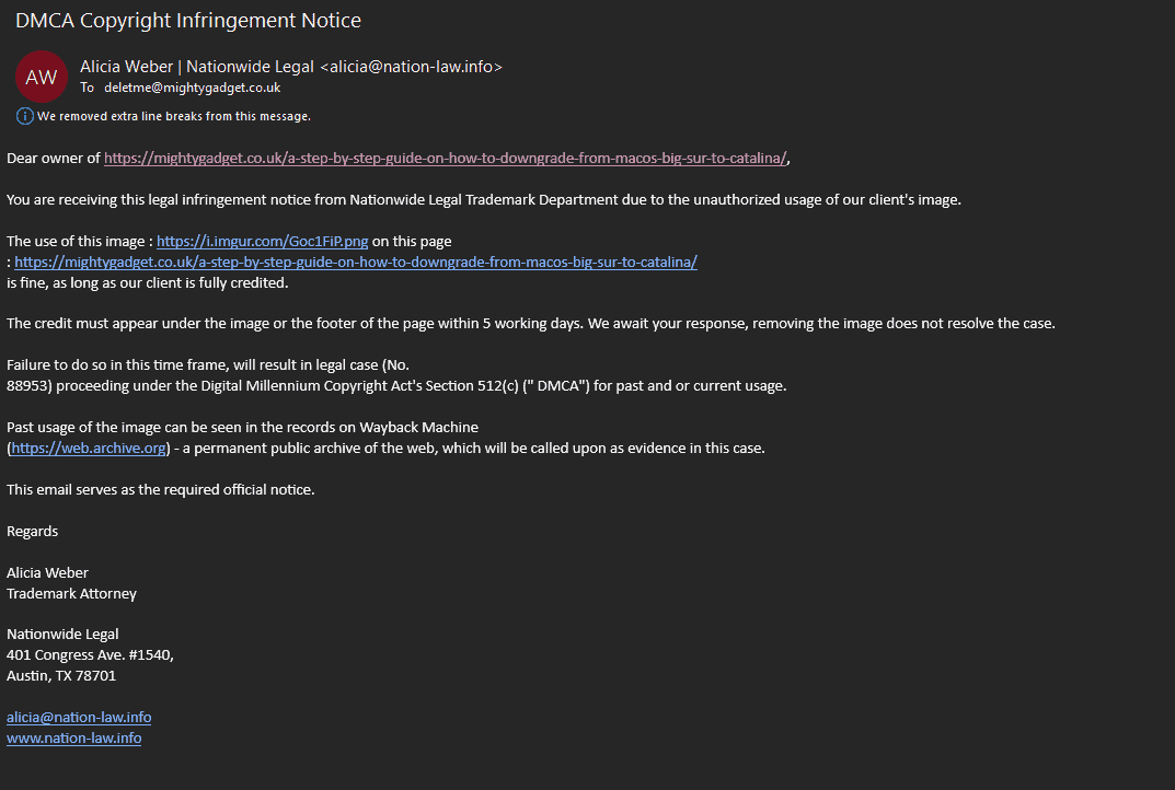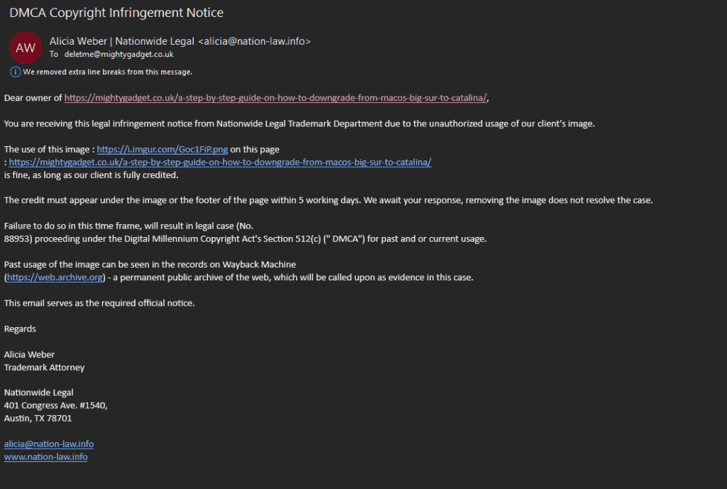 Unfortunately, nefarious companies try and exploit this vulnerability by faking DMCA notices. They will select an image from a free stock photo site, knowing the publisher has likely not attributed the image and certainly not paid for it.