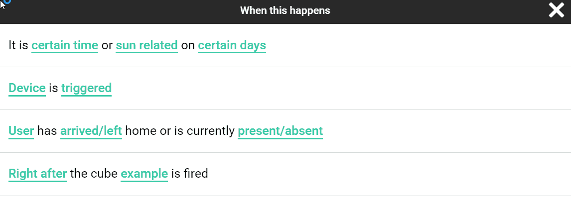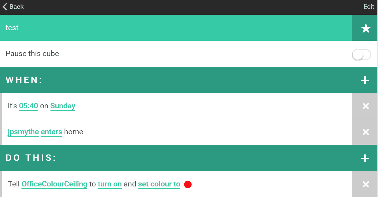 Under the DO THIS section you then tell the device to do something or send a message to a user. With both sections, you can add more than one rule. So, you could have when it is Monday and I arrive home, switch on the Nest and Philips Hue lights. You can also have it so that all or just 1 of the triggers launch a cube.
