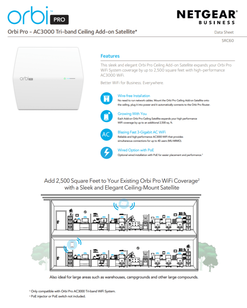 NETGEAR Business’ Orbi Pro Mesh Wi-Fi Ceiling Satellite connects with the Orbi Pro Router or any other Orbi Pro satellite via the patented FastLane3 technology with a dedicated wireless backhaul for environments where wiring is challenging or impossible. Alternatively, in new builds or office expansions where power outlets are unavailable or new AC wiring is cost prohibitive, the Orbi Pro Ceiling can be powered by using ethernet cables with (PoE) utilising 4×4 MU-MIMO Wi-Fi to cover denser environments. Automatic power and channel management between satellites enable superior roaming, coverage and performance making Orbi Pro the ideal solution for large areas.