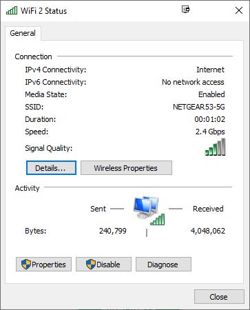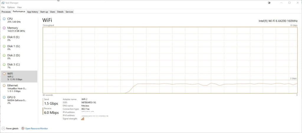 While the network card reported over 1.2Gbps frequently, which would indicate the 2×2 connection at 160Mhz, I think interference means it wasn’t actually able to connect at this speed.