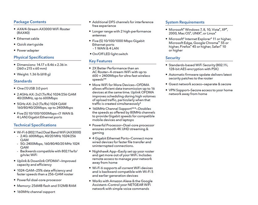 The Nighthawk AX4 is Gig+ capable and makes it possible for you to start experiencing the benefits of Wi-Fi 6 in an affordable way, offering a performance and coverage boost compared with legacy Wi-Fi 5 (802.11ac) routers.