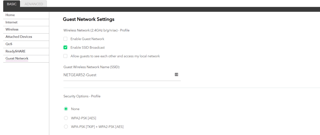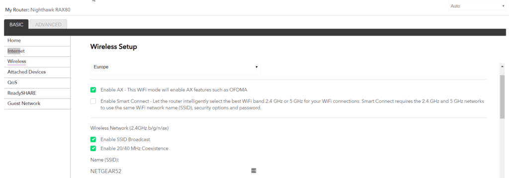 With the Wi-Fi 6 settings, there is not much different from the usual options, you can enable/disable AX features, though I am not sure why you would switch them off. Smart Connect will allow you to combined the 2.5GHz and 5Ghz channels into one SSID. You can then select the speeds for the two channels, with 2.4Ghz now going up to 1200Mbps and 5Ghz going up to 4.8Gbps. To achieve that speed you need to use 160 MHz wide frames which can be tricky to get and won’t work properly if you live close to an airport or another radar installation.