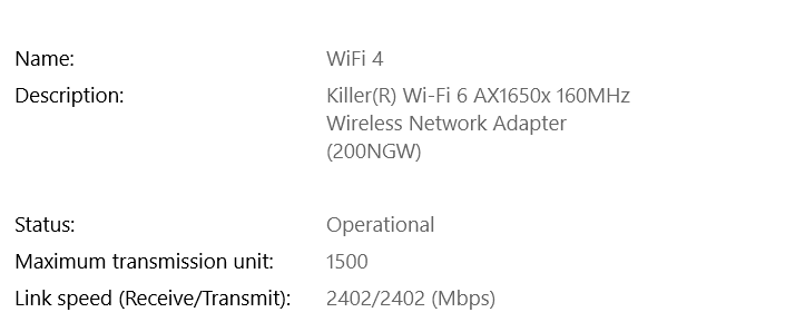 It is worth noting that my laptop reports a link speed of 2402Mbps, while the Netgear supports up to 4.8Gbps the Killer network model only goes up to 2.4Gbps.