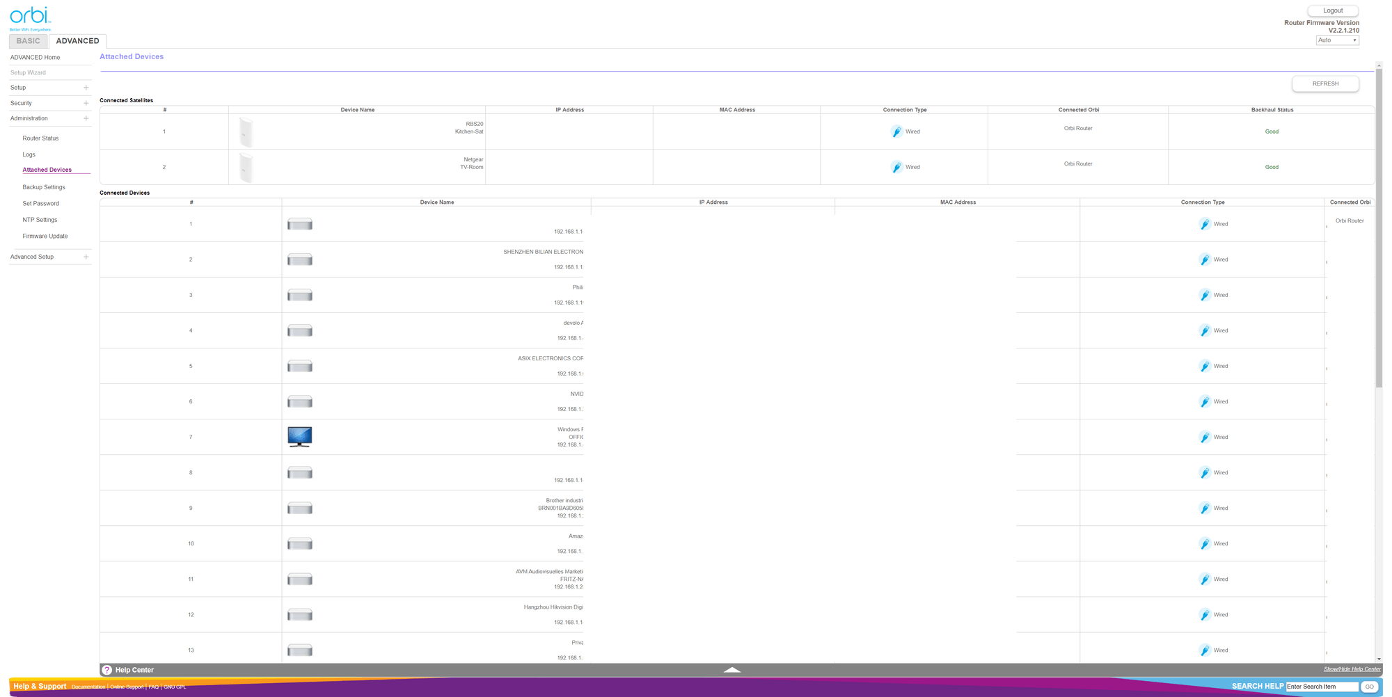 - Device list with IP address, MAC Address and connection type