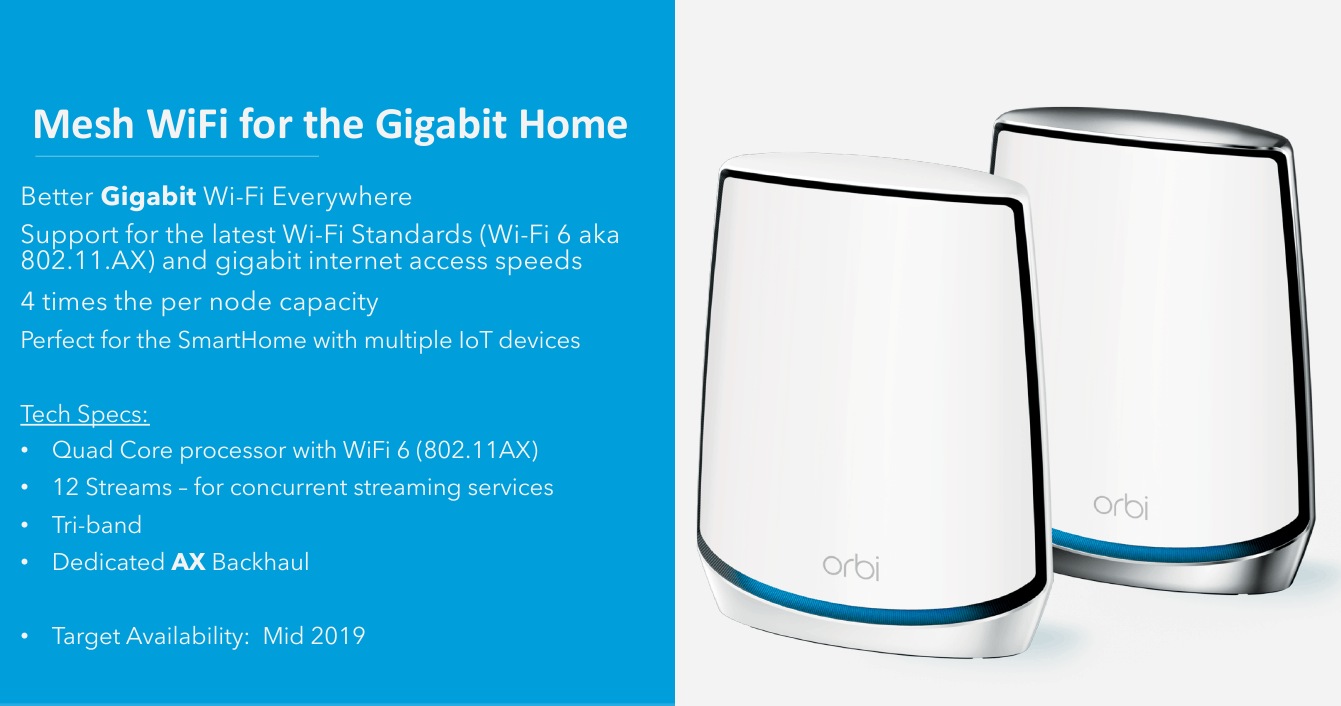 With an advanced quad-core processor by Qualcomm, Orbi with Wi-Fi 6 will support even higher performance simultaneous Wi-Fi streams, making it possible to deliver gigabit internet to far more devices and enable these gigabit internet homes to take advantage of new Wi-Fi 6 performance, which will be designed into the next generation of mobile and smart home devices.