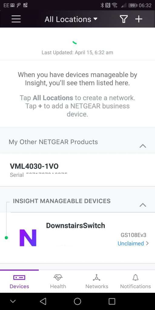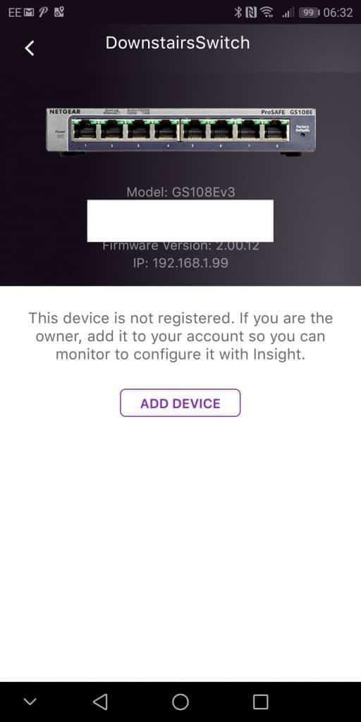 The Inside App is very slow to detect devices, and it found my two GS108Ev3 switches before the Insight switch. I ended up getting so impatient with the auto scan I had to manually add the GC110P. You can do this via QR code, barcode or serial number. The first 2 times it wouldn’t add via QR code or barcode, and it eventually decided to work on my last go with the QR.