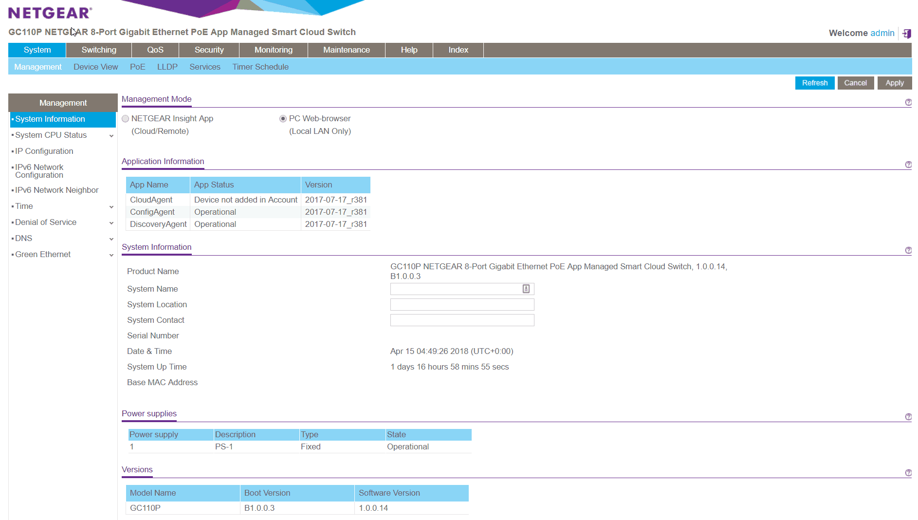You can manage the switch in two modes, a traditional browser-based mode or via the Insight App. For some reason, you can only control things using one method, so if you have Insight enabled, you can only manage the switch via the App, and vice versa. The PC browser option means that you can only manage things locally, and when you log-in locally when Insight is enabled you can easily switch over management options. So if you are on-site, you may find it easier to handle things via a browser.
