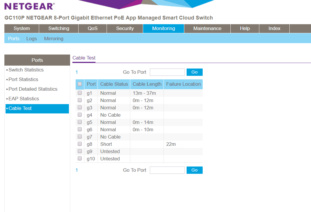 Pretty much all managed/smart switches have some form of port diagnostics, and it is a feature I love, it makes diagnosing issues with the network much more straightforward. The GC110P has useful cable testing features allowing you to see if and where there is a fault on a cable.
