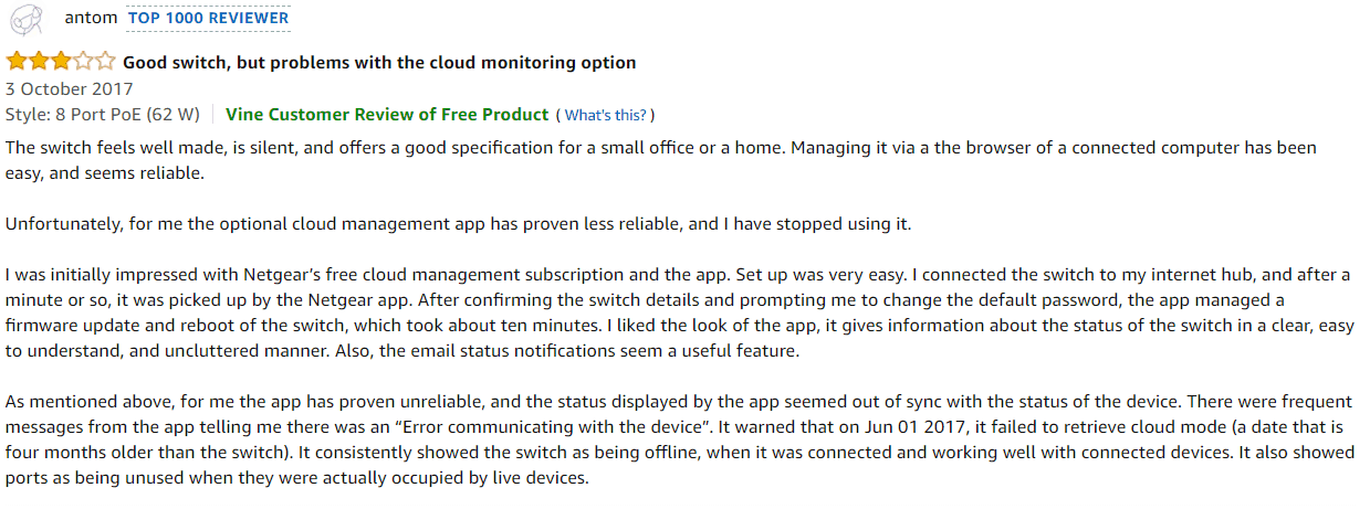 Update: Since the issues I had setting up the switch, it has been in use in my main office room without any issues at all. I have started to come round to it and I might even replace my other switches. Network speeds are excellent, as you would expect. I get phone and email notifications when there are network issues, such as power outages, and managing the switch via the app is quite simple, especially the setting up of VLANs, which is something I have always wanted to do but never got round to. The app is still slow to load then recognise devices, using a stopwatch it took 18 seconds to load the Insight app then detect my devices. Not really an issue for 1 insight switch and 2 other Netgear switches when I only load it once a week, but a network admin might feel differently if they manage dozens of devices.