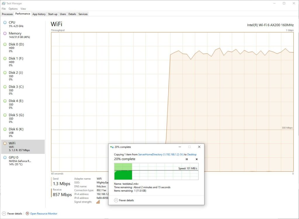 Copying a large MKV file between the server and my desktop the WAX214 outperformed the Unifi 6 Lite consistently sitting at over 100MB/s or around 860Mbps vs 90MB/s (800Mbps)