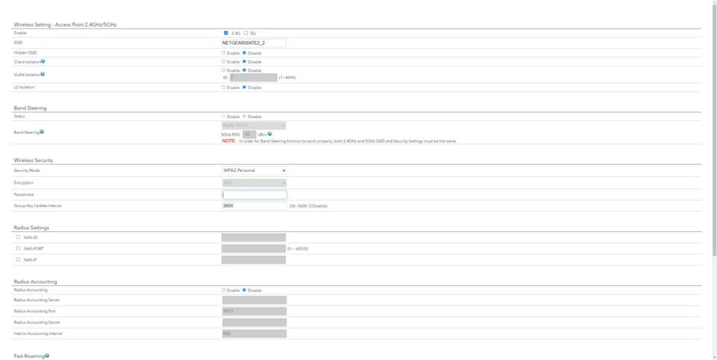 Within the SSID settings, you will find options for fast roaming, allowing this to hand off to other WAX214 access points seamlessly. According to one of the Netgear Insight Engineers on Reddit, roaming should work well with the WAX214 when using WPA2-PSK/WPA3-PSK. It is only if you intend on using WPA2-Enterprise (RADIUS based auth) will the more advanced WAX610 Insight model be beneficial.