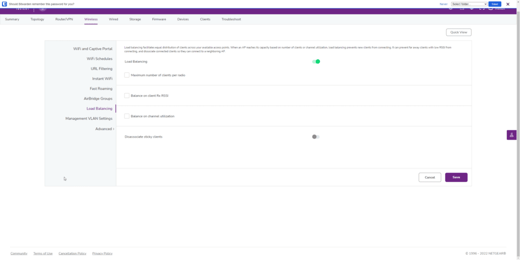 - Load balancing (for denser environments. Load balancing facilitates equal distribution of clients across your available access points.)