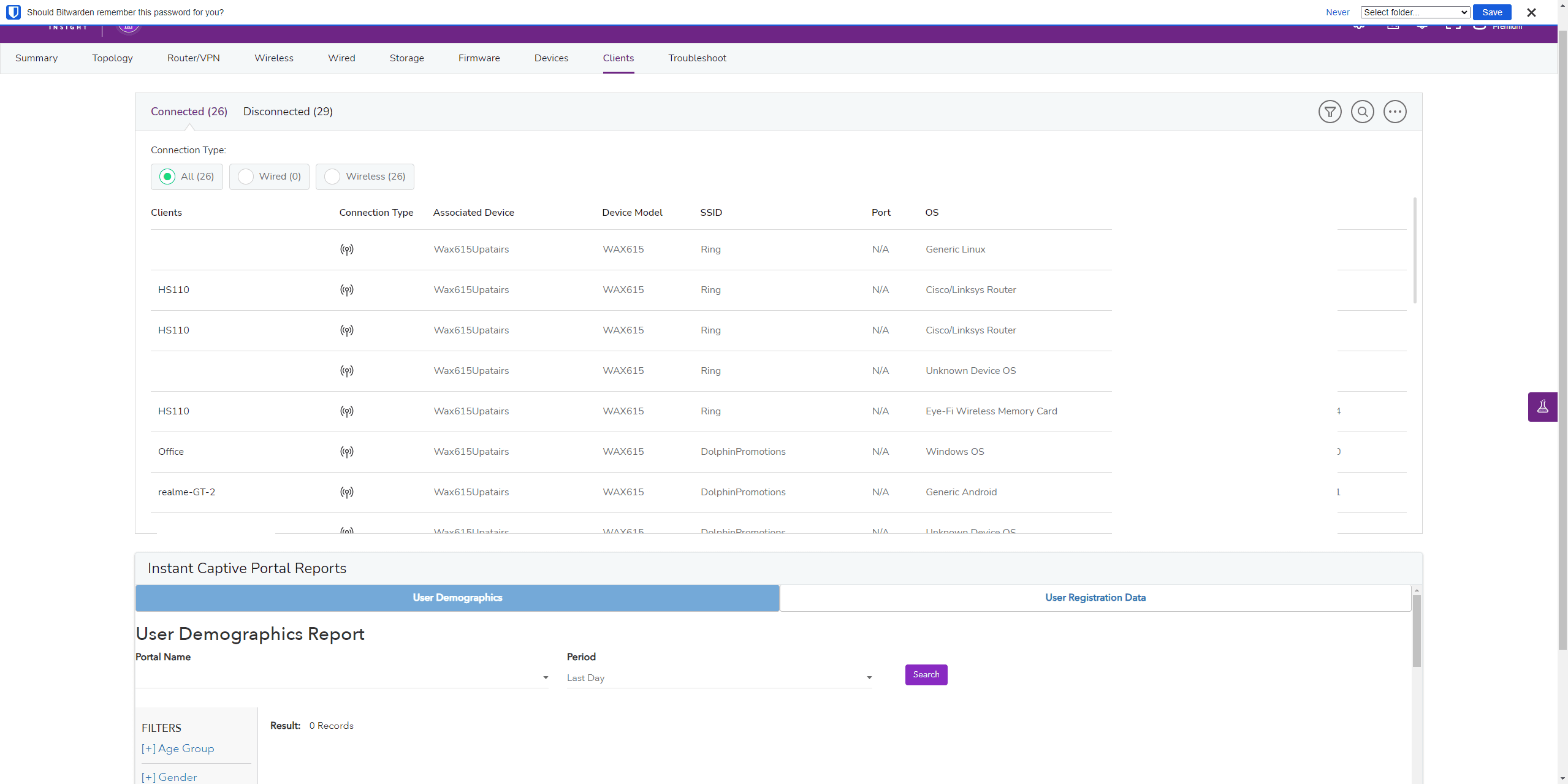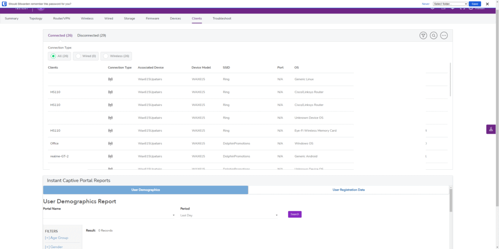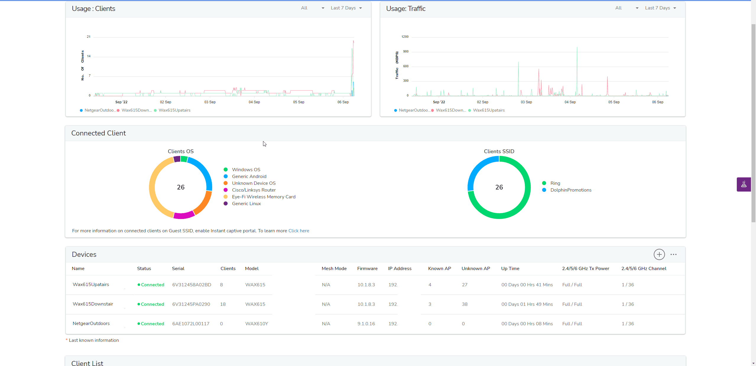 - A list of clients which can then be expanded to via OS data, signal strength, SSID, mode, security and basic traffic statistics