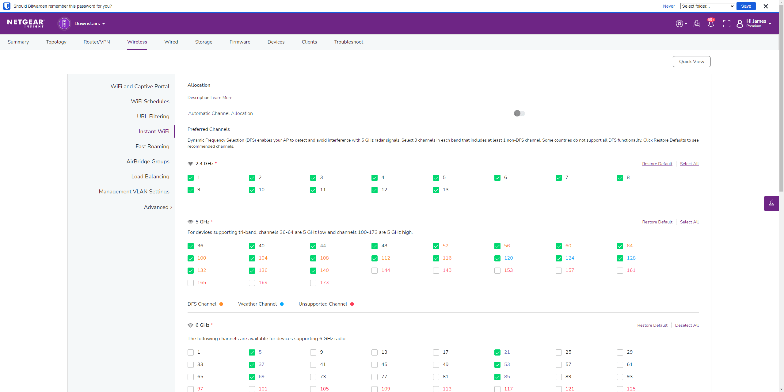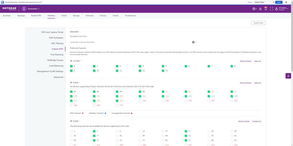 Like most routers/access points, by default, the device will automatically select the optimal channel. During my testing with these Insight access points, I haven’t had a problem, but they have all defaulted to channel 1 for 2.4Ghz and 36 for 5Ghz. The WAX615 access points are also running at 160Mhz. This seems like a sub-optimal configuration.