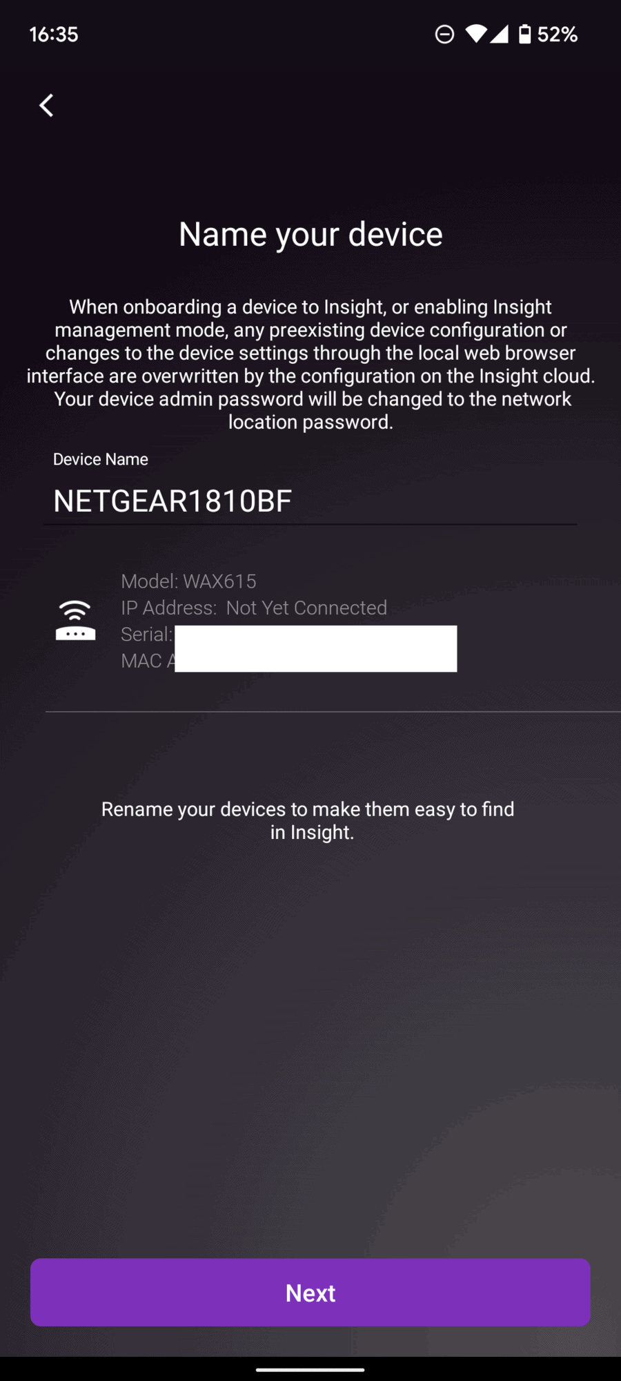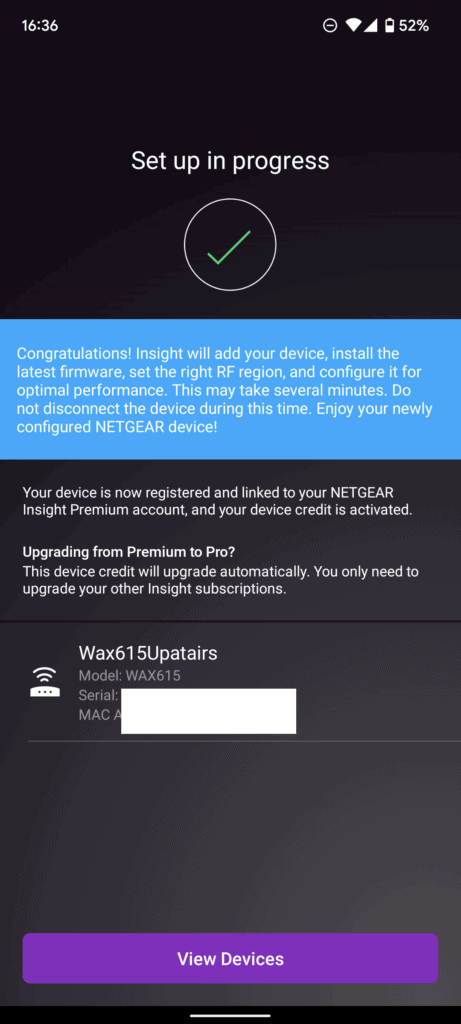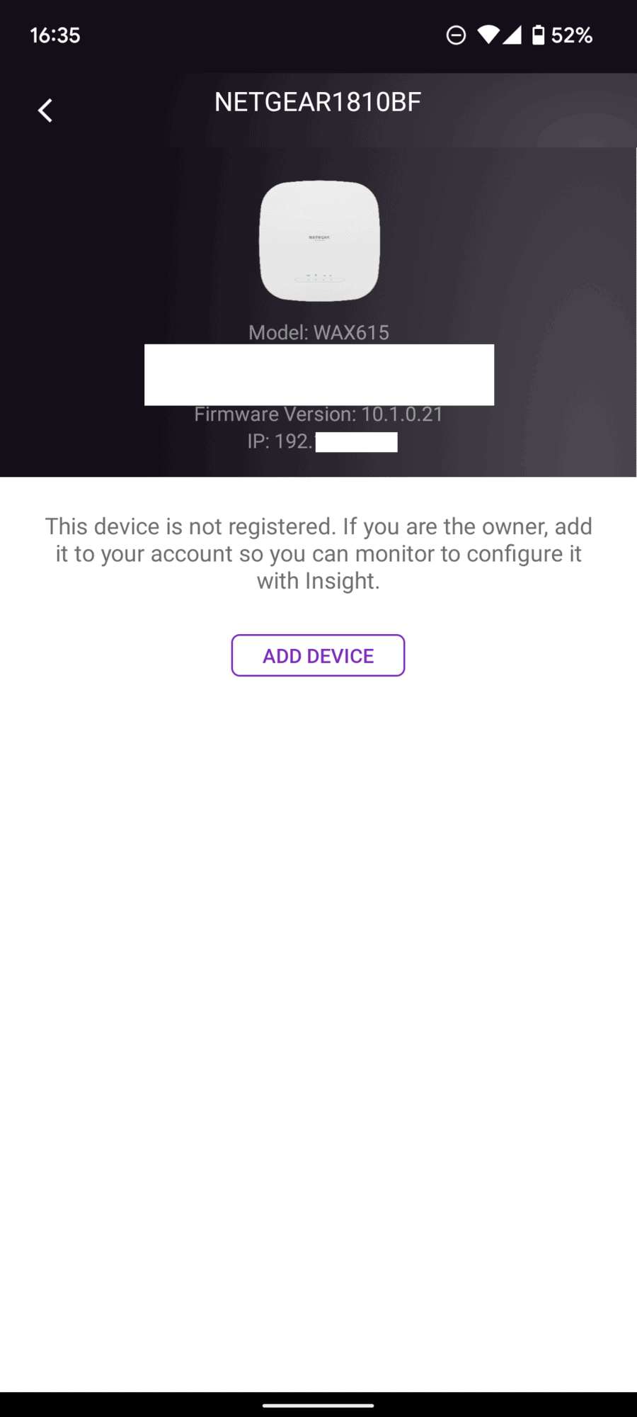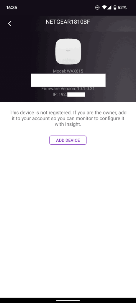 For the WAX610Y, I was able to add this into Netgear Insight, but it didn’t have a licence, so it showed up as an unmanaged device. I then applied a monthly licence via account management.