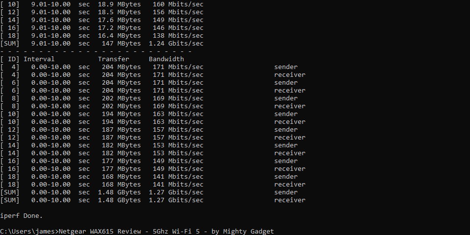 Switching to the slower WiFi 5 also achieves excellent results with a throughput of 1.27 Gbits/sec with iPerf.