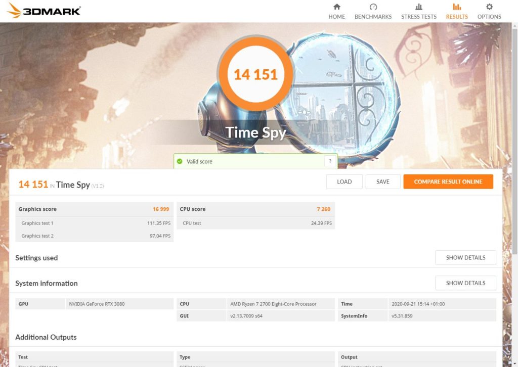 In TimeSpy, my system achieved a score of 14,151 with a graphics score of 16,999 and CPU score of 7,311.
