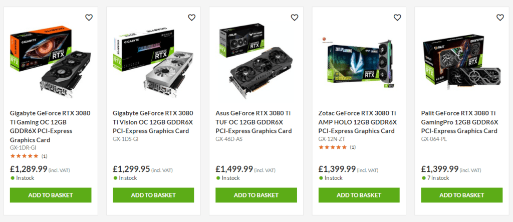 Similarly, the Nvidia RTX 3080 Ti prices have dropped, I reported that the cheapest price in January was just shy of £1600, but this has now dropped down to just under £1300, which is a significant 18.75% decrease in price. Though that’s still 23.8% higher than the £1050 MSRP of the Founders Edition.