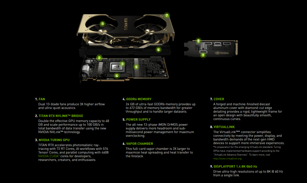 | Nvidia Founders Edition Graphics | Titan RTX | Geforce RTX 2080 Ti | Geforce RTX 2080 | Geforce RTX 2070 |