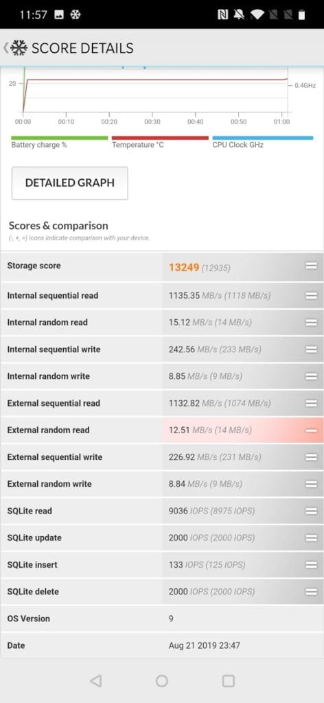 Input/Output Operations Per Second is another factor that will affect your performance and here we see impressive results again. For reads, the OP7 gets 9090 IOPs while the Black Shark gets 8010. Then for the update, insert, delete test, the OP7 has double the performance with 2000, 133, and 2000 IOPS vs 1000, 66, and 1000 IOPS.