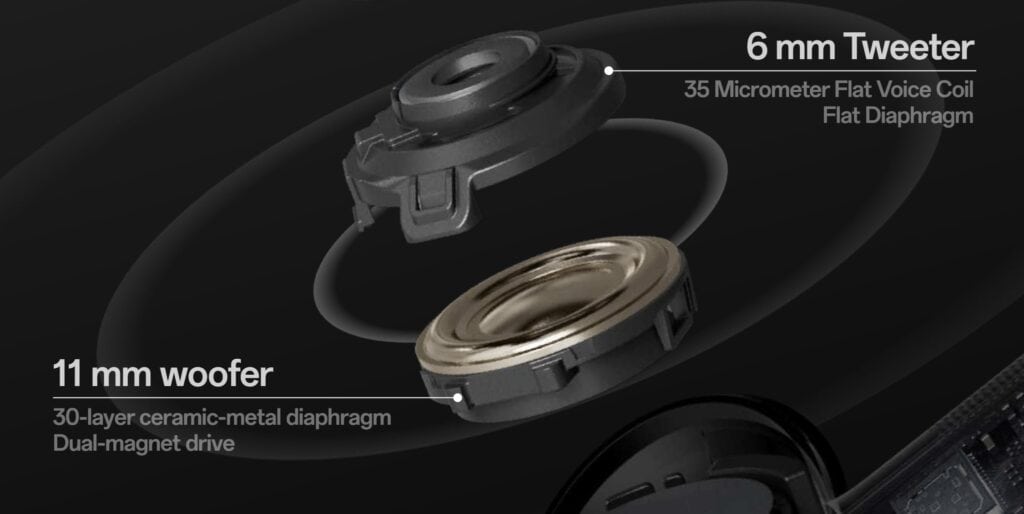 - Improved dual drivers: The earbuds feature an 11mm woofer and a 6mm tweeter. The woofer now includes a second magnet for increased power generation, and its diaphragm has been rebuilt using a ceramic-metal composite material to improve audio sensitivity and sound accuracy. The tweeter incorporates a 35-micrometer flat voice coil, which enhances high-frequency detail reproduction.