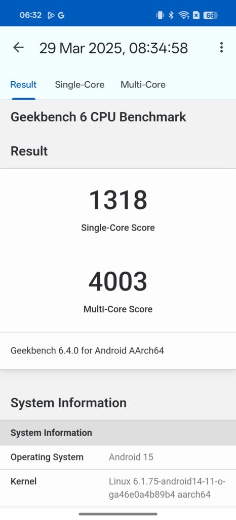 • GeekBench 6: 1,318 (single-core) and 4,003 (multi-core)