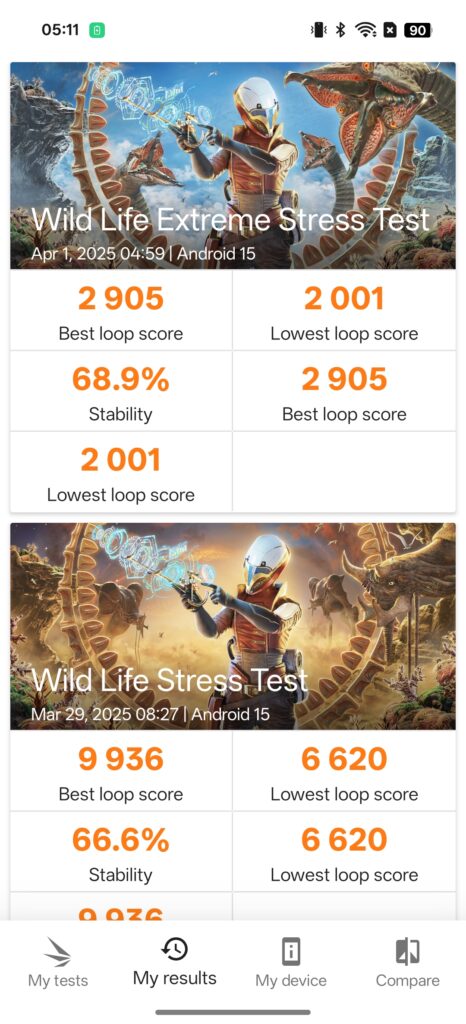 • 3DMark Wild Life: 9936 best, 6620 lowest, 66.6% stability