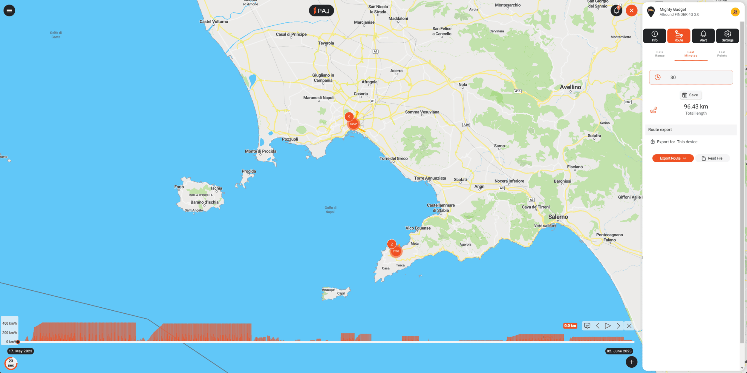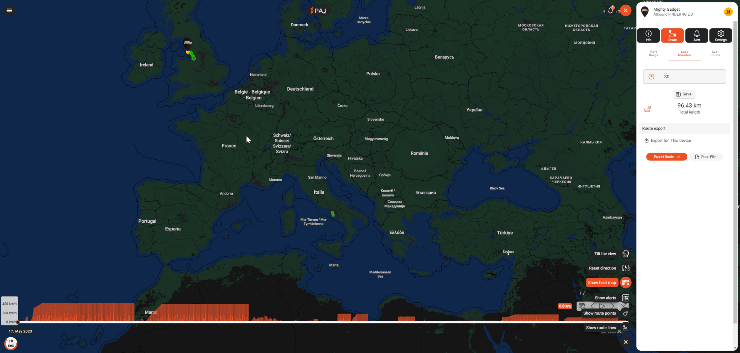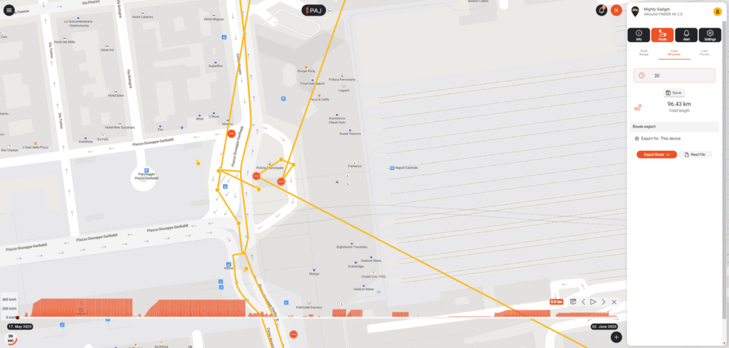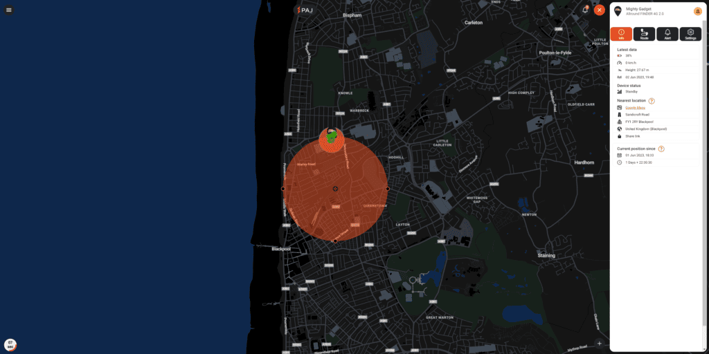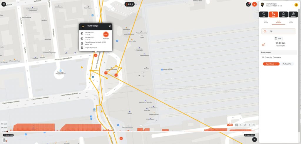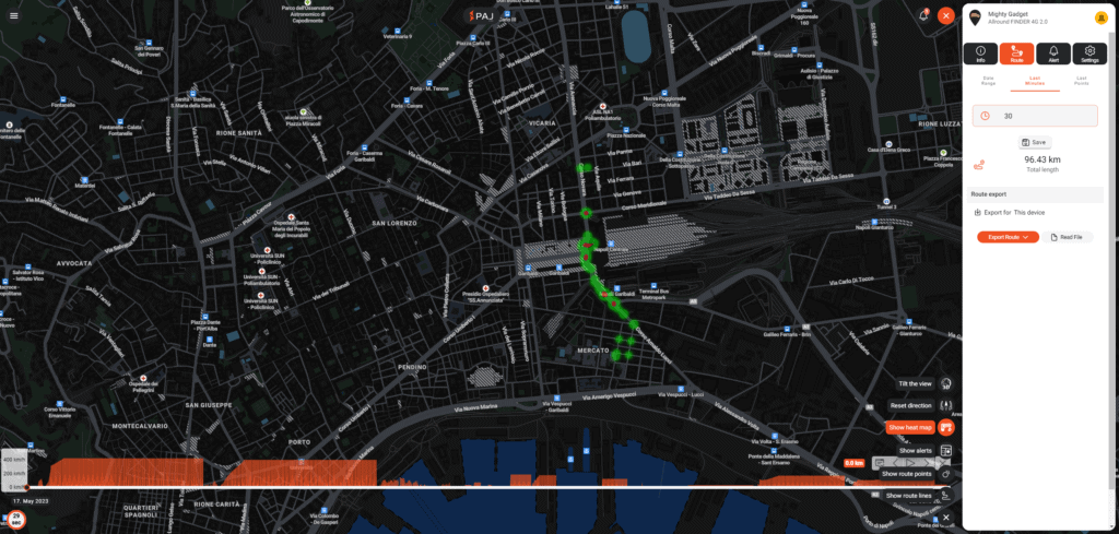 The route tab is a useful feature which will plot the GPS data points onto a map. You can have it displayed using a heatmap so you can visualise how long it has been in a certain place.