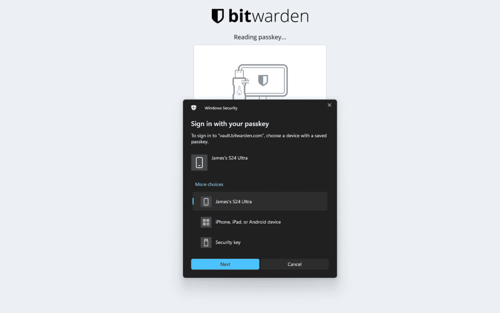 You can subsequently fill the passkey to login through Bitwarden. If you get a new device, syncing your Bitwarden vault will transfer the passkey.This allows Bitwarden to manage, fill and sync your passkeys alongside traditional passwords – bringing passkeys into your existing password management workflow.