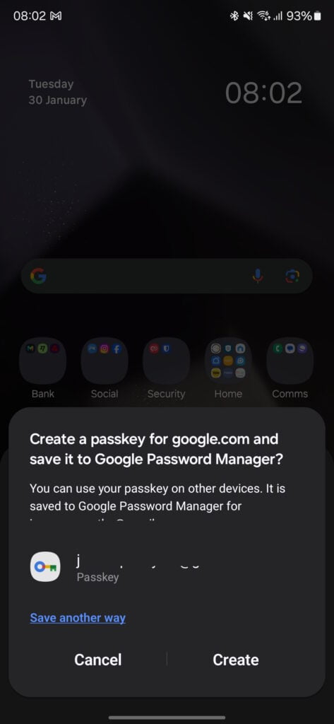 Similarly, when I logged into WhatsApp and Facebook Messenger, I was prompted to create a Passkey to allow me to access messages across devices. In this case, I chose not to use Samsung Pass but linked them to my Google account.