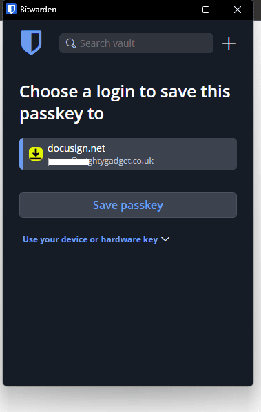 Then, when logging into eBay and DocuSign on my Geekom Mini IT13, I was prompted by Bitwarden to use a Passkey.