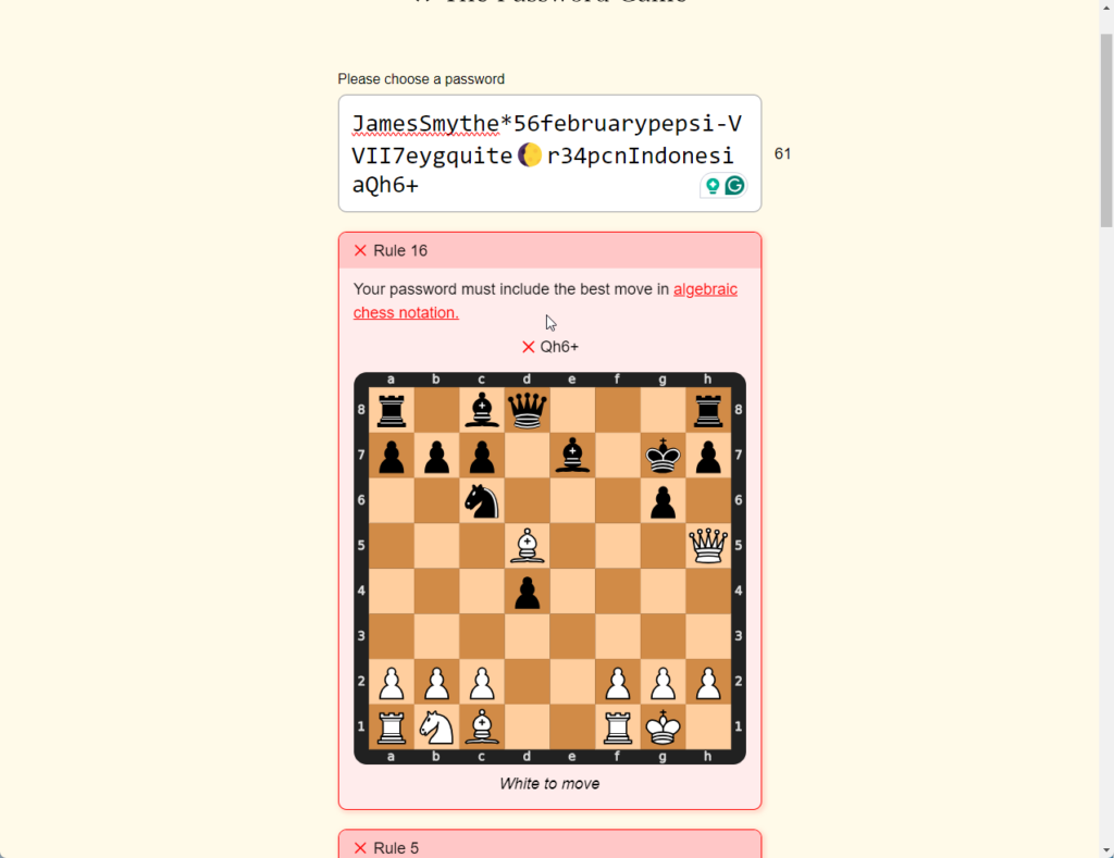 Rule 16 of The Password Game requires you to include the best chess move in algebraic notation based on a given chess board position.