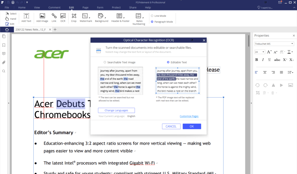 Here the software performed excellently, to edit text you just hit the edit button and the software highlights all the editable areas. Anything that looks like normal text can be edited, however in the ThermalTake document the title had a shadow applied to it, so the software converted this to text and then overlaid it.