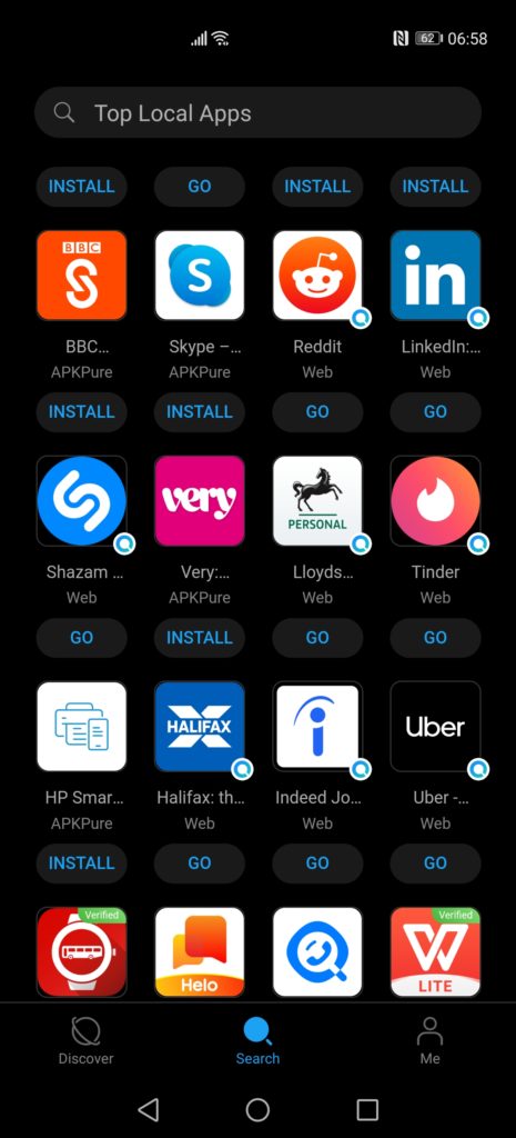 When you search for an app it will search the official App Gallery but also pull in results from APKPure, APKCenter, Aptoide and other third party sources it will then also provide links to the mobile versions of websites if applicable. In some cases you can download the APK from the official websites this includes both WhatsApp and Facebook.