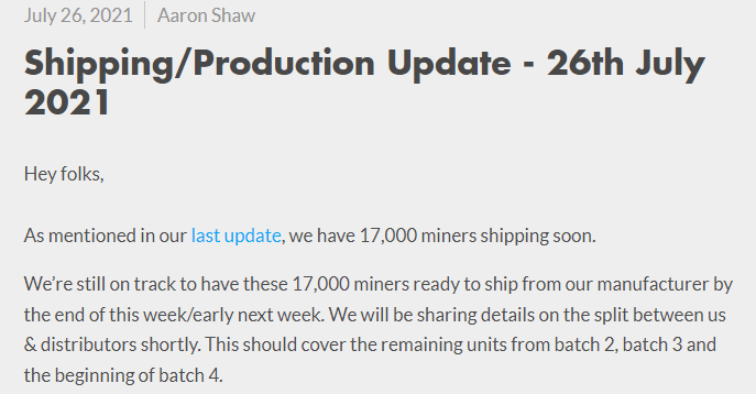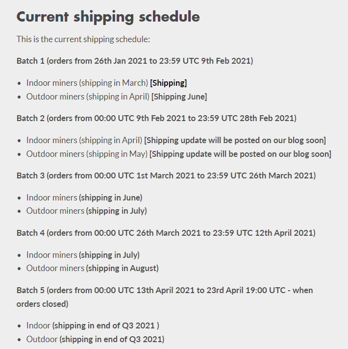 “Unfortunately, as we are now shipping indoor and outdoor miners from batches 4 and 5 we are unable to accept order cancellation requests from these batches at this time.”