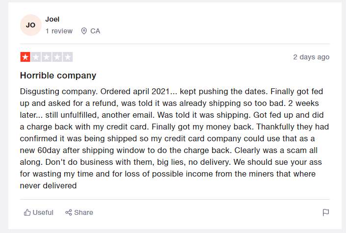 I, therefore, decided to try and cancel the order. With the crypto crash, £1500 was too much money for me to potentially lose if they never shipped it, and if they did ship them, it would be hard to recoup my investment.