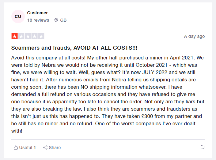 Nope, I’ve still not got mine 15 months later – and all my correspondence is word for word the same correspondence that you received. What is more – I moved home and they said that they couldn’t change the address. As a solution, they said I should purchase ANOTHER miner under the new address via DIRECT BANK TRANSFER, and they would refund me for the first one purchased. Considering I’d been waiting for over a year for the first miner – this was the most absurd solution I’ve ever come across. And they requested I do a direct bank transfer – it offered me no protection whatsoever. Of course, most people buying a HNT miner are (hopefully) too web savvy to fall victim to the bank transfer scam. However, if you weren’t alarmed by the company’s dealings before – certainly be alarmed now! After my experience, I see little difference between Nebra Ltd, and the Nigerian Prince.