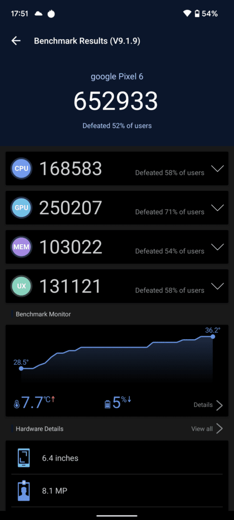 I have already covered the benchmarks of the Google Tensor chipset in a bit more detail. The overall performance of the phone is outstanding. It has easily handled all the day to day tasks I do, the advanced image editing features have barely any processing time, and the phone is more than powerful enough to play games like Genshin Impact smoothly.