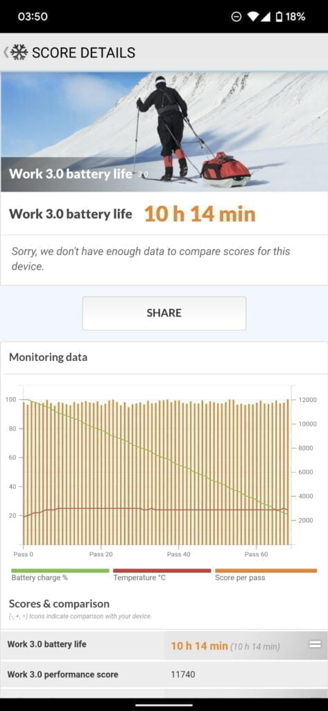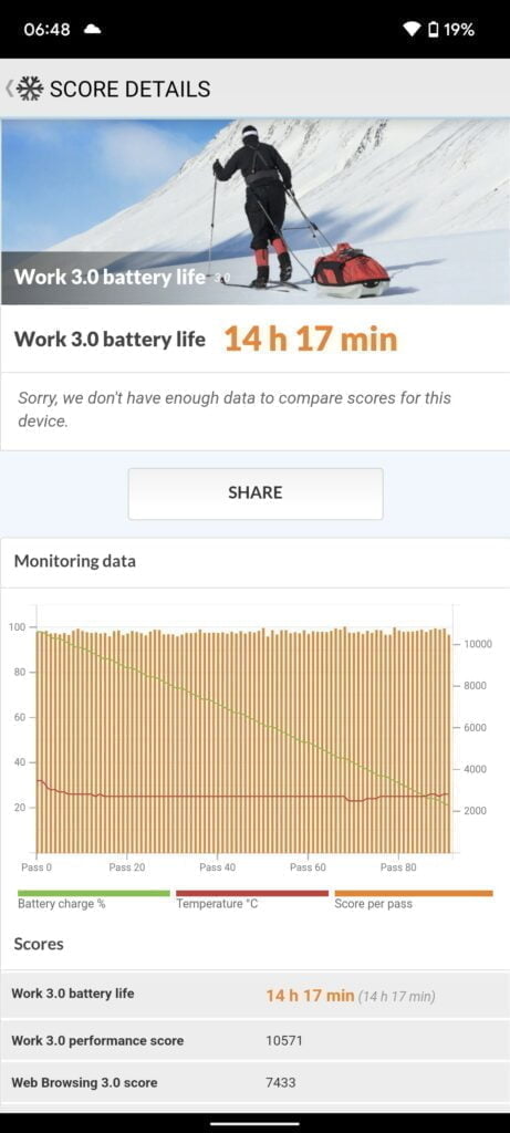 For the PCMark battery test, it scored good results, better than the likes of the OnePlus 9 Pro, but not as good as the S21 Ultra.