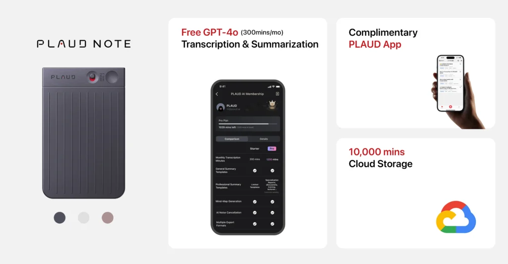 The Plaud Note comes with a free starter plan, which includes 300 mins/month for GPT-4o transcription & summarisation.